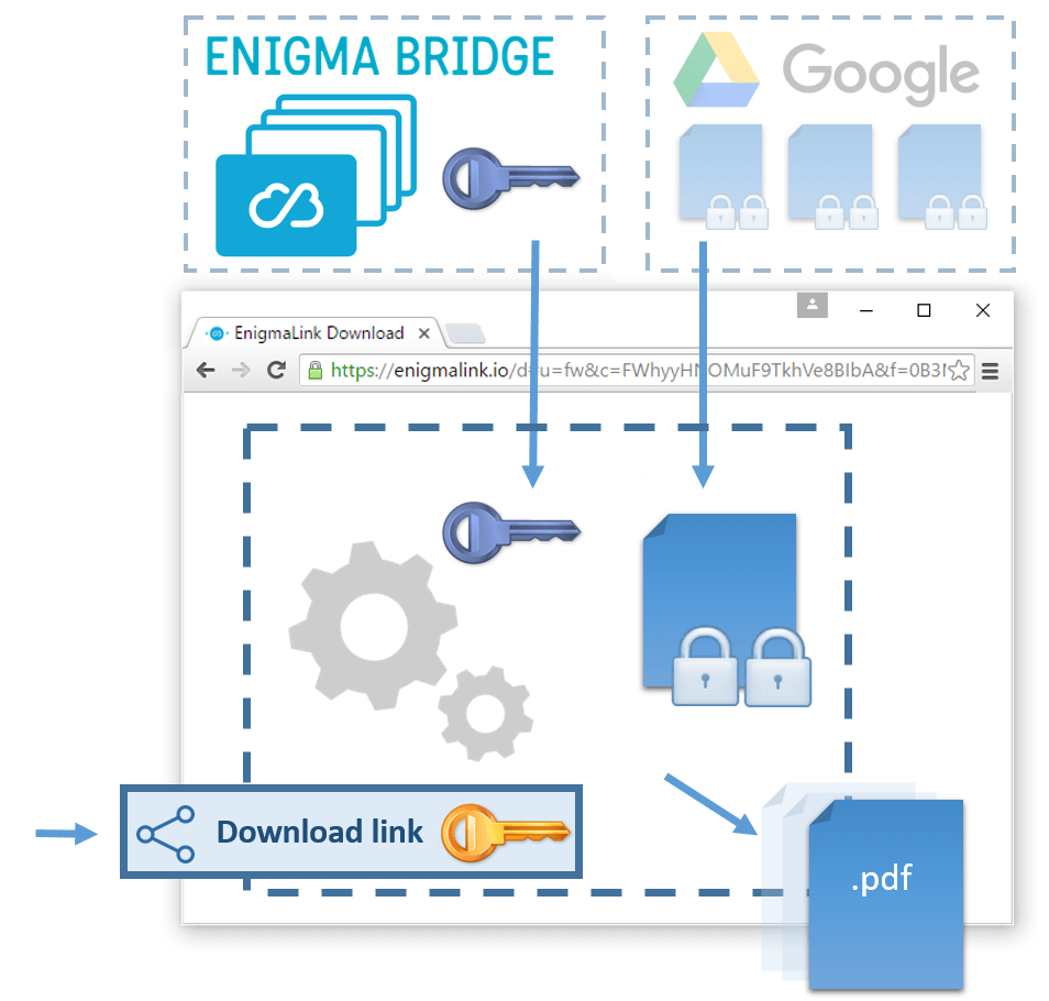 EnigmaLink uses two or three locks. One lock is in the link your share, another lock is a key protected by Enigma Bridge and there is an optional password.